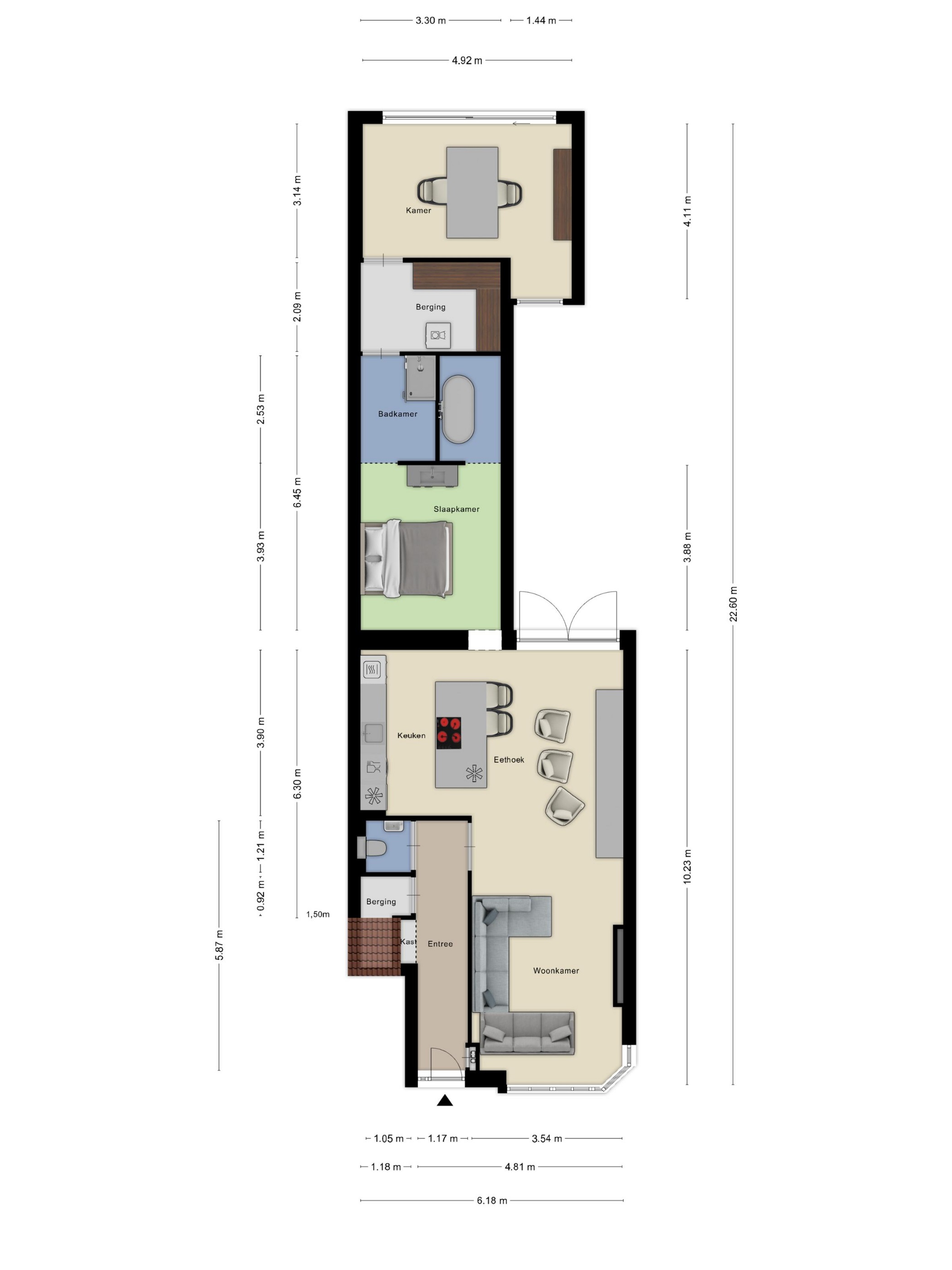 Bij de voordeur proef je direct de karakteristieke sfeer van de woning. Via de ruime entree en stijlvolle taatsdeur bereik je de royale woonkamer. Doordat de oorspronkelijke scheiding tussen woonkamer en keuken is doorbroken, is er een lichte en open leefruimte ontstaan. De volledig geïsoleerde en gestorte vloer draagt bij aan comfort en duurzaamheid. Vanuit de woonkamer loop je via openslaande deuren zo de zonnige, besloten tuin in.