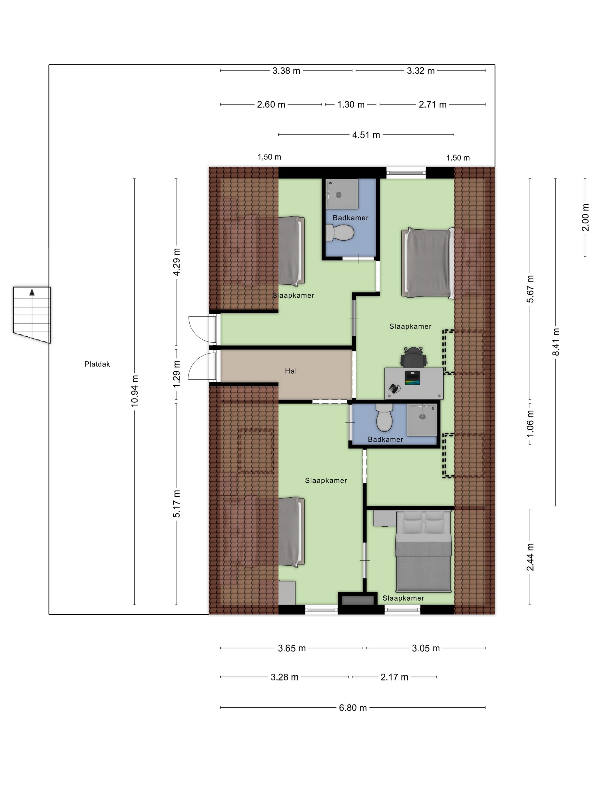 Hal/overloop met toegang tot een viertal slaapkamers en 2-tal eenvoudige badkamers, mogelijkheid tot realiseren van een woonkamer en extra daglicht.