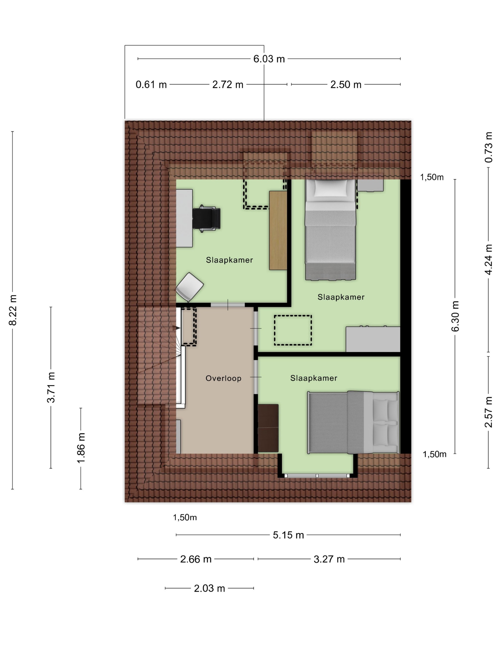 3 slaapkamers (ca. 8, 7 en 10,5 m²) met een dakraam of dakkapel, wandafwerking sierpleister, vloer afgewerkt met tapijt, plafond afgewerkt met stucwerk, vanuit de slaapkamer rechtsachter een vlizoluik naar de bergzolder op de derde verdieping.