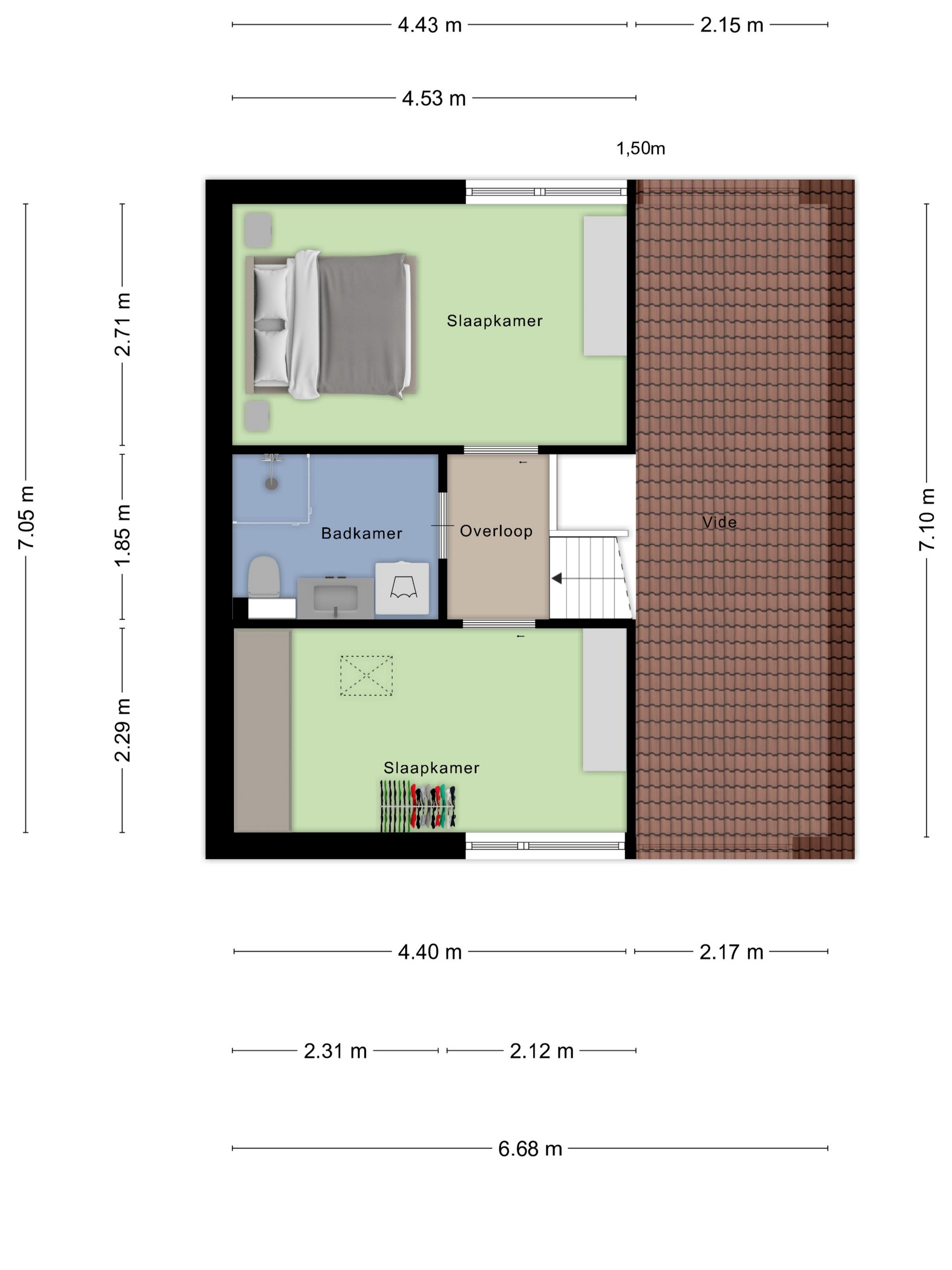 Slaapkamer voorzijde met een vlizotrap naar bergzolder, wandafwerking sierpleister, laminaatvloer, plafond afgewerkt met stucwerk;