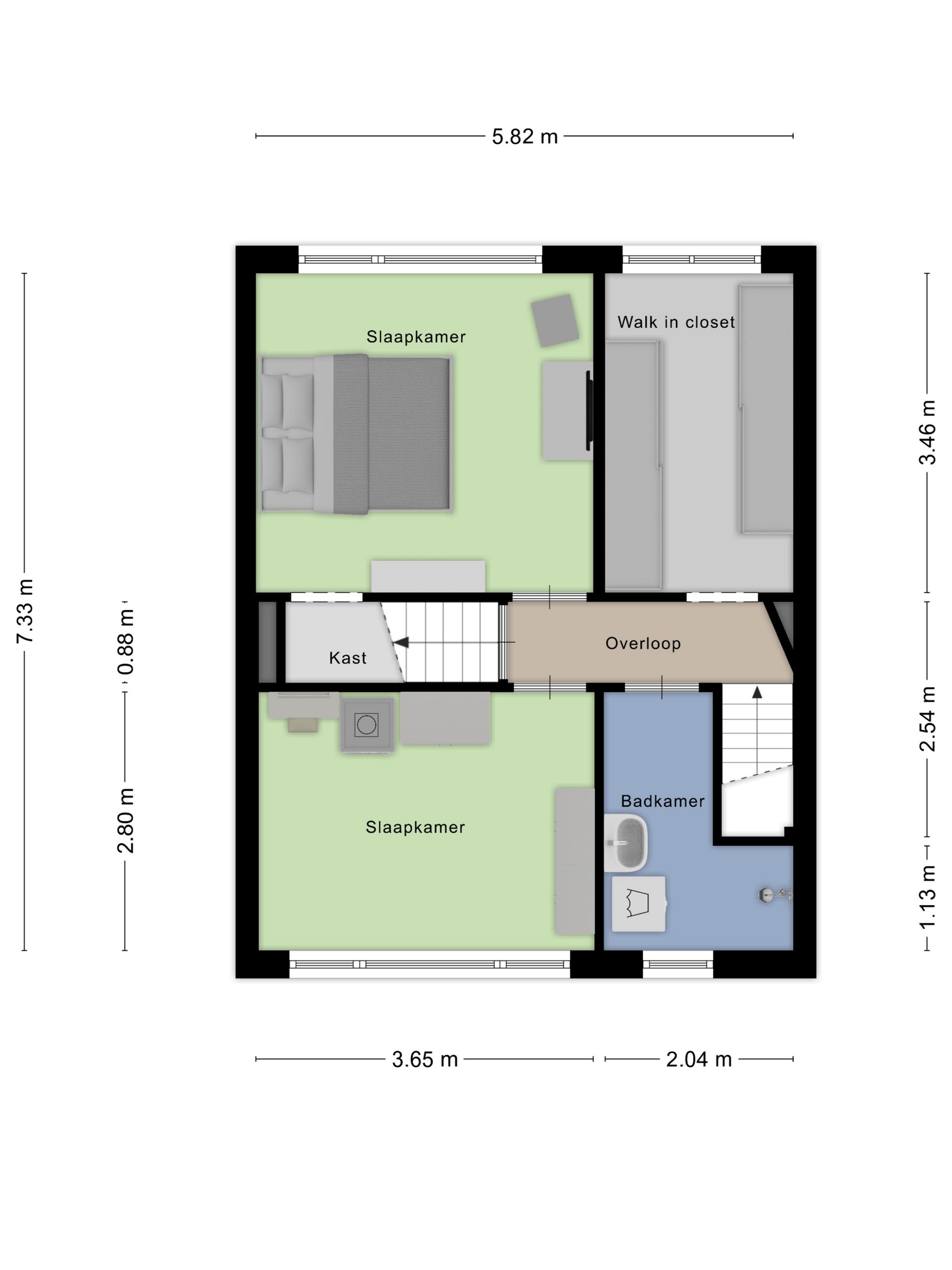 3-tal slaapkamers waarbij de hoofdslaapkamer is voorzien van een inbouwkast en de slaapkamer rechtsachter in gebruik is als inloopkast, wandafwerking sierpleister en behang, laminaatvloer en zeil, plafond afgewerkt met gipsplaten;