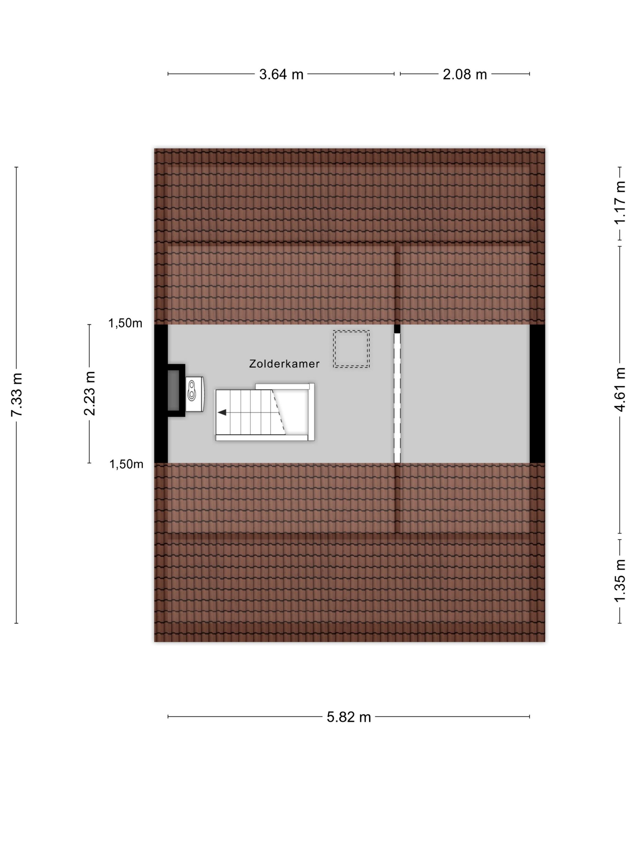 Open bergzolder met opstelplaats HR-combiketel (huur) en collector zonnepanelen, wandafwerking stucwerk, vloer afgewerkt met tapijt, houten dakbeschot in het zicht.