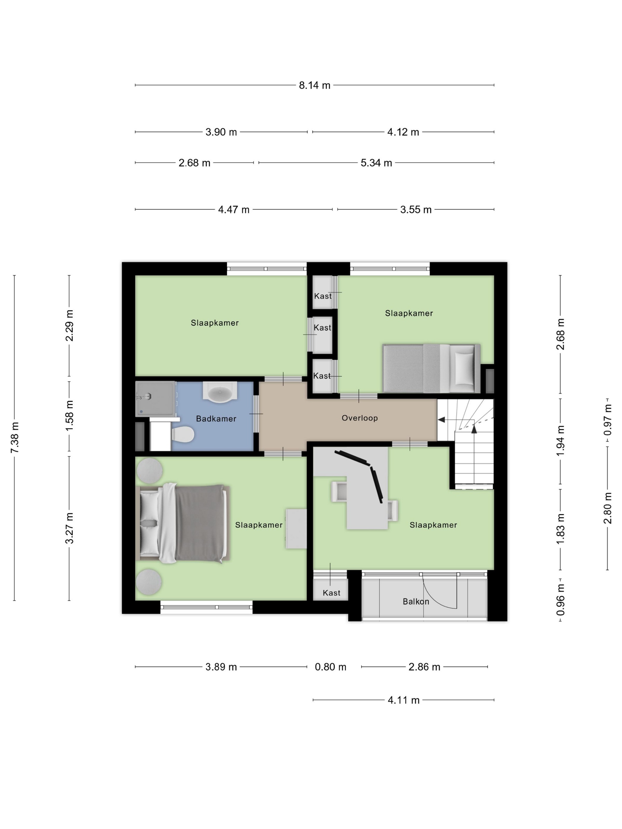 slaapkamer rechts voor (ca. 10,5 m²) voorzien van inbouwkast, toegang tot het balkon en trap naar 2e verdieping, wandafwerking behang, eiken vloer, plafond afgewerkt met gipsplaten;