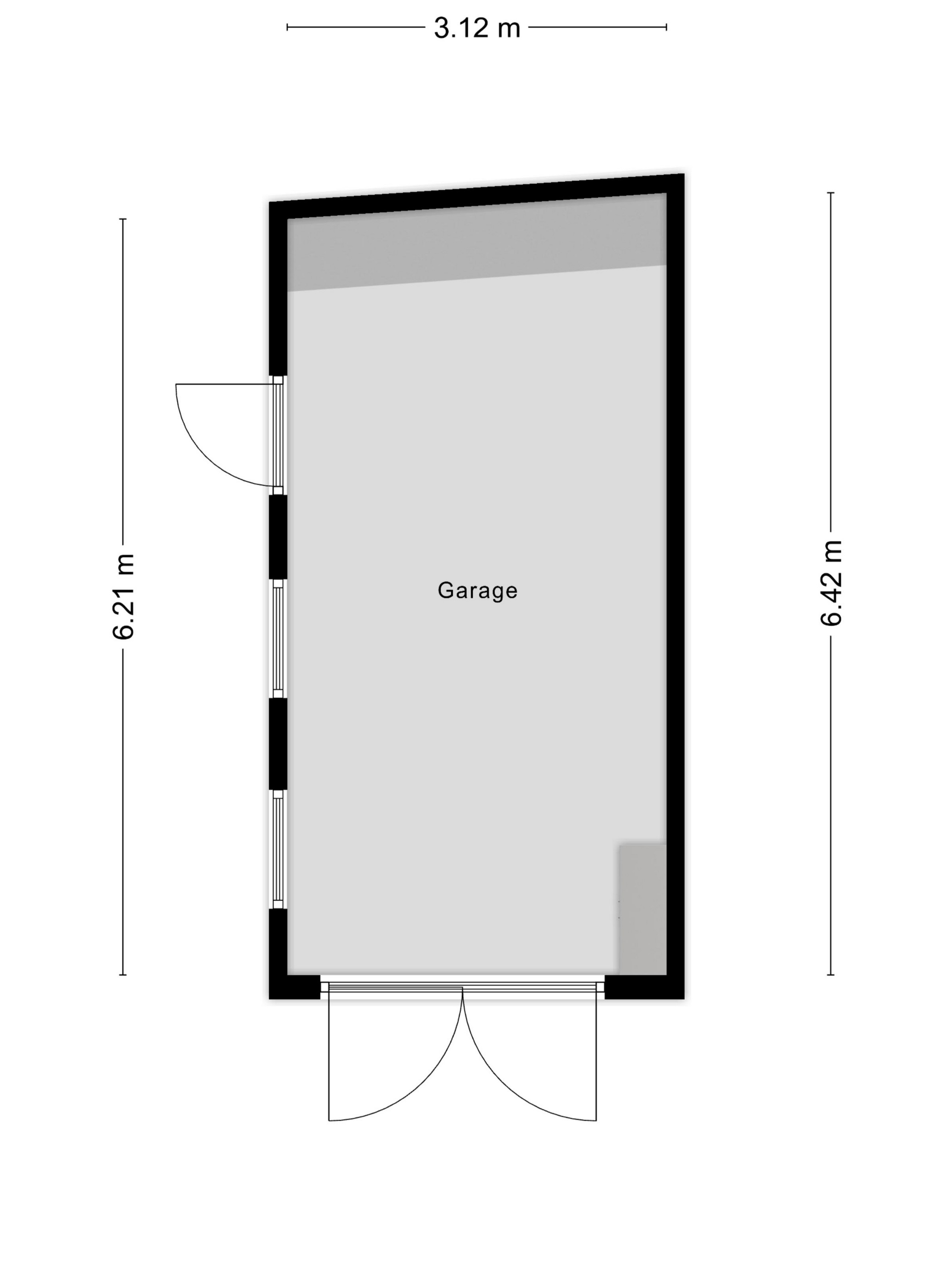 Gemetselde garage voorzien van elektra, loopdeur en een dubbele houten deur t.b.v. auto, opgetrokken in metselbaksteen, plat dak uitgevoerd middels mastiek afgedekt met grind (plat dak aan leeftijd onderhevig).