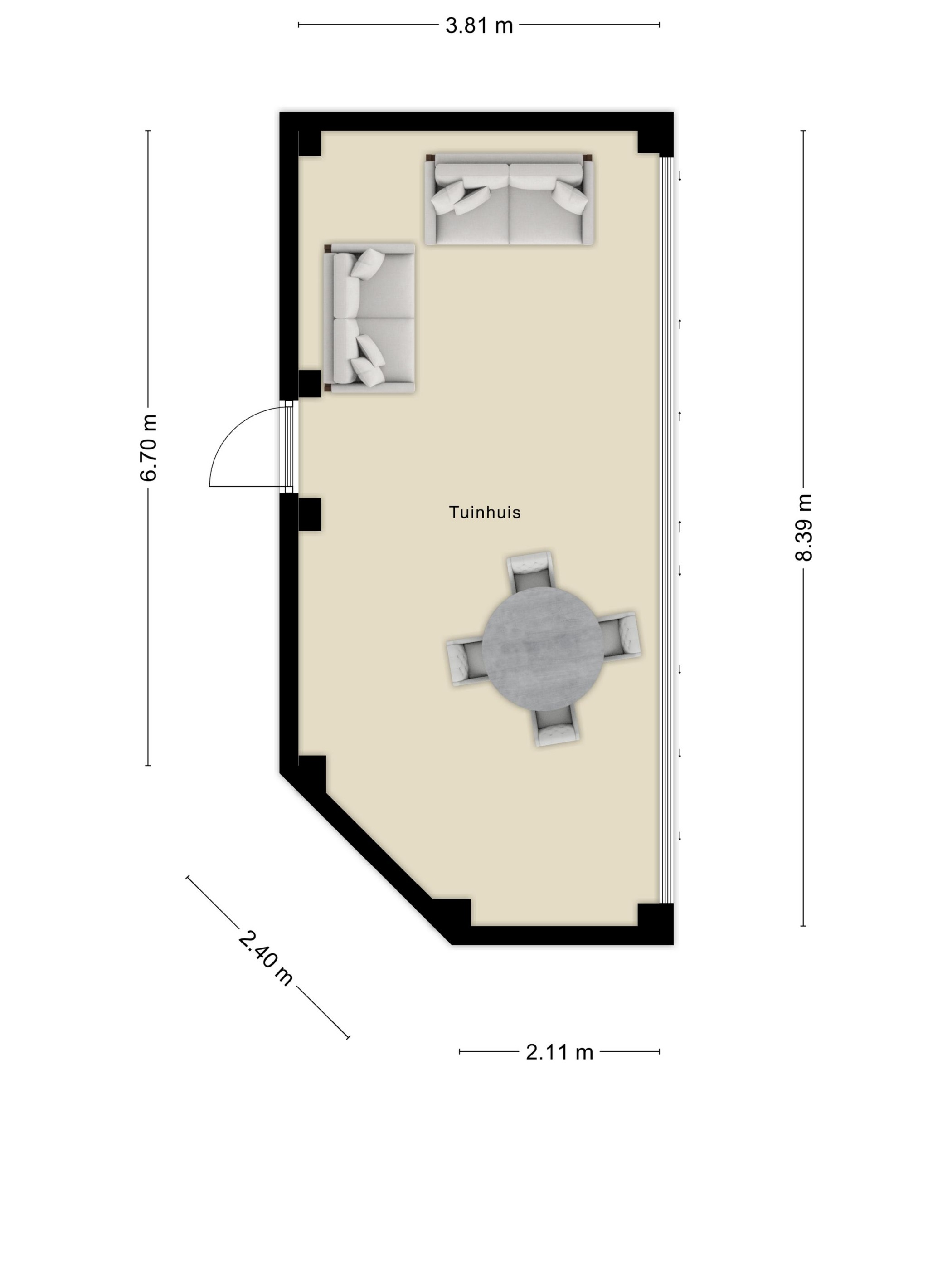 Strak aangelegde tuin, terras bestraat met 60×60 sierbestrating, voorzien van borders, verlichting, kunstgazon, elektrisch zonnescherm vv. windsensor, gemetselde omheining vv. achterom, luxe veranda over de volledige breedte van het perceel, opgetrokken in metselbaksteen vv. een glazen pui, elektra en verlichting.