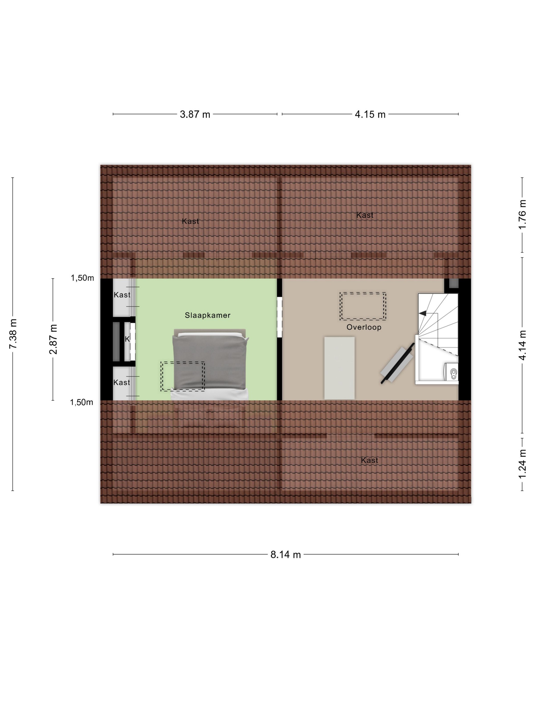 5e slaapkamer (ca. 8 m²) met bergkasten onder het schuine dakvlak en een dakraam aan de voorzijde, wandafwerking stucwerk, laminaatvloer, schuine dakvlakken afgewerkt met kunststof platen.