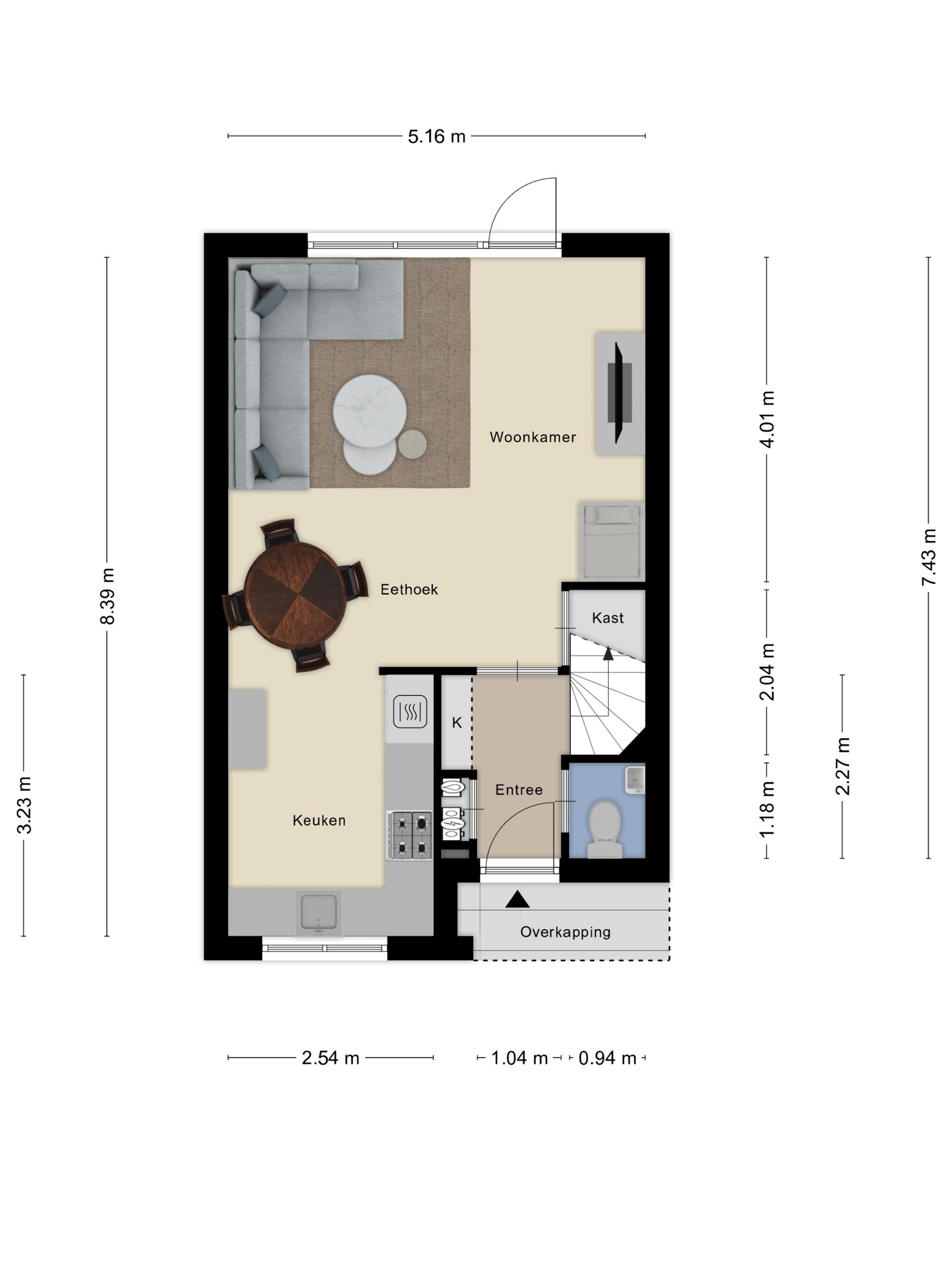 Hal/entree met een trap naar de 1e verdieping, wandafwerking stucwerk, laminaatvloer, plafond afgewerkt met stucwerk, stalen deur naar woonkamer;