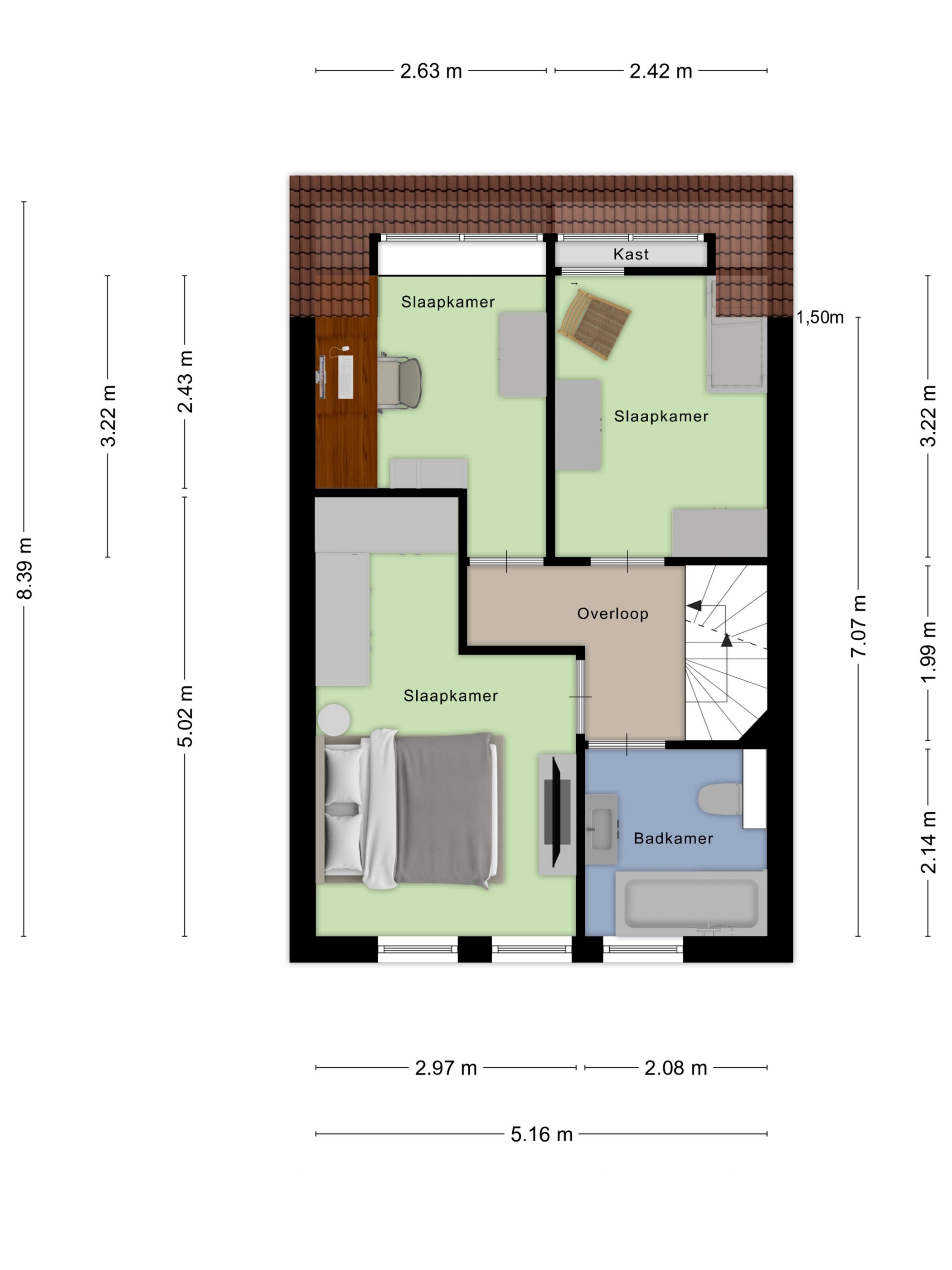 4e slaapkamer (ca. 8,5 m²) met bergkasten onder het schuine dakvlak en een dakraam, wandafwerking stucwerk en behang, laminaatvloer, schuine dakvlakken afgewerkt met sauswerk.