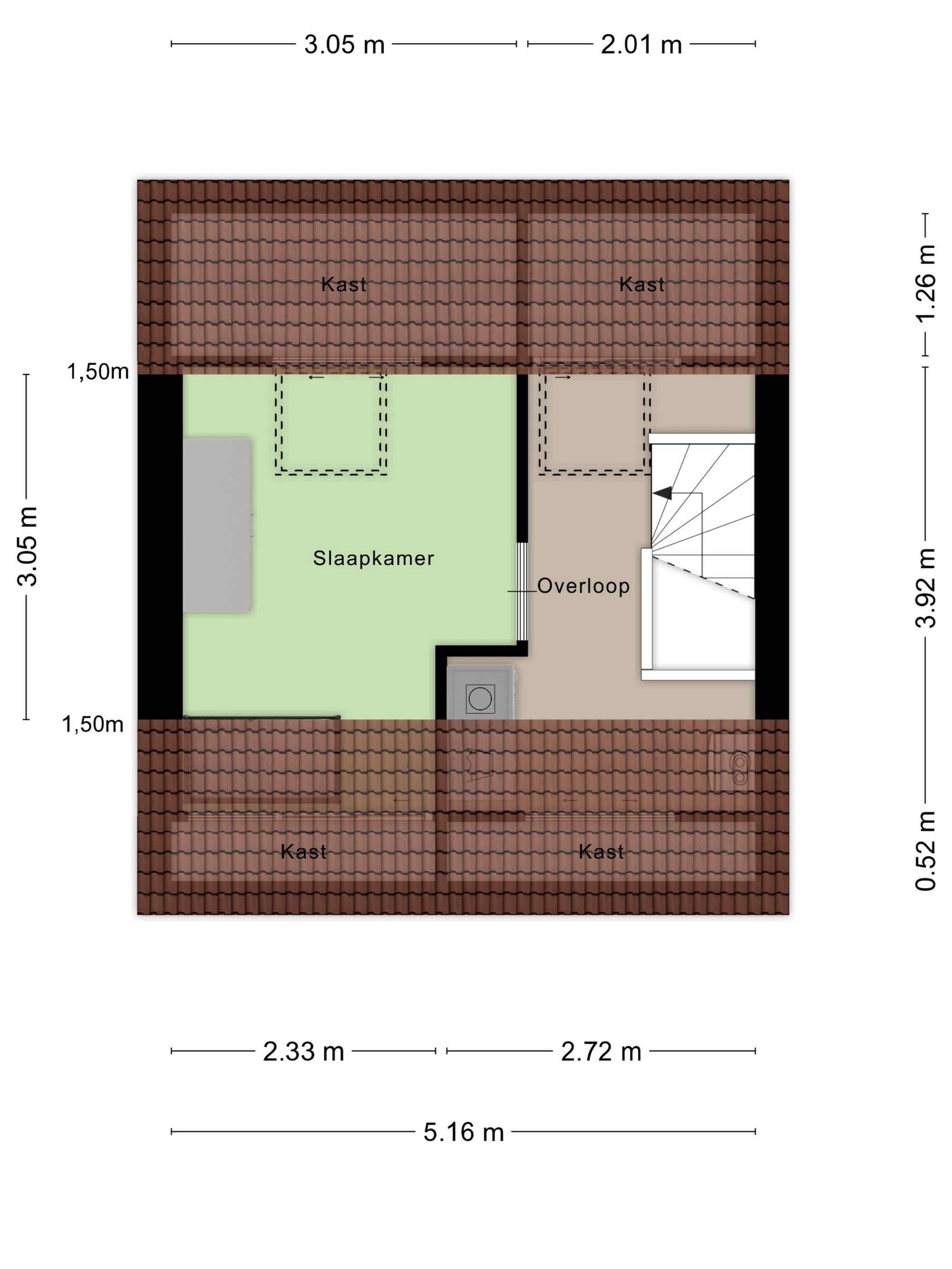 slaapkamer rechts achter (ca. 8 m²) met een kunststof dakkapel, rolluik en bergkast onder het schuine dakvlak, wandafwerking stucwerk en behang, laminaatvloer, plafond afgewerkt met stucwerk;