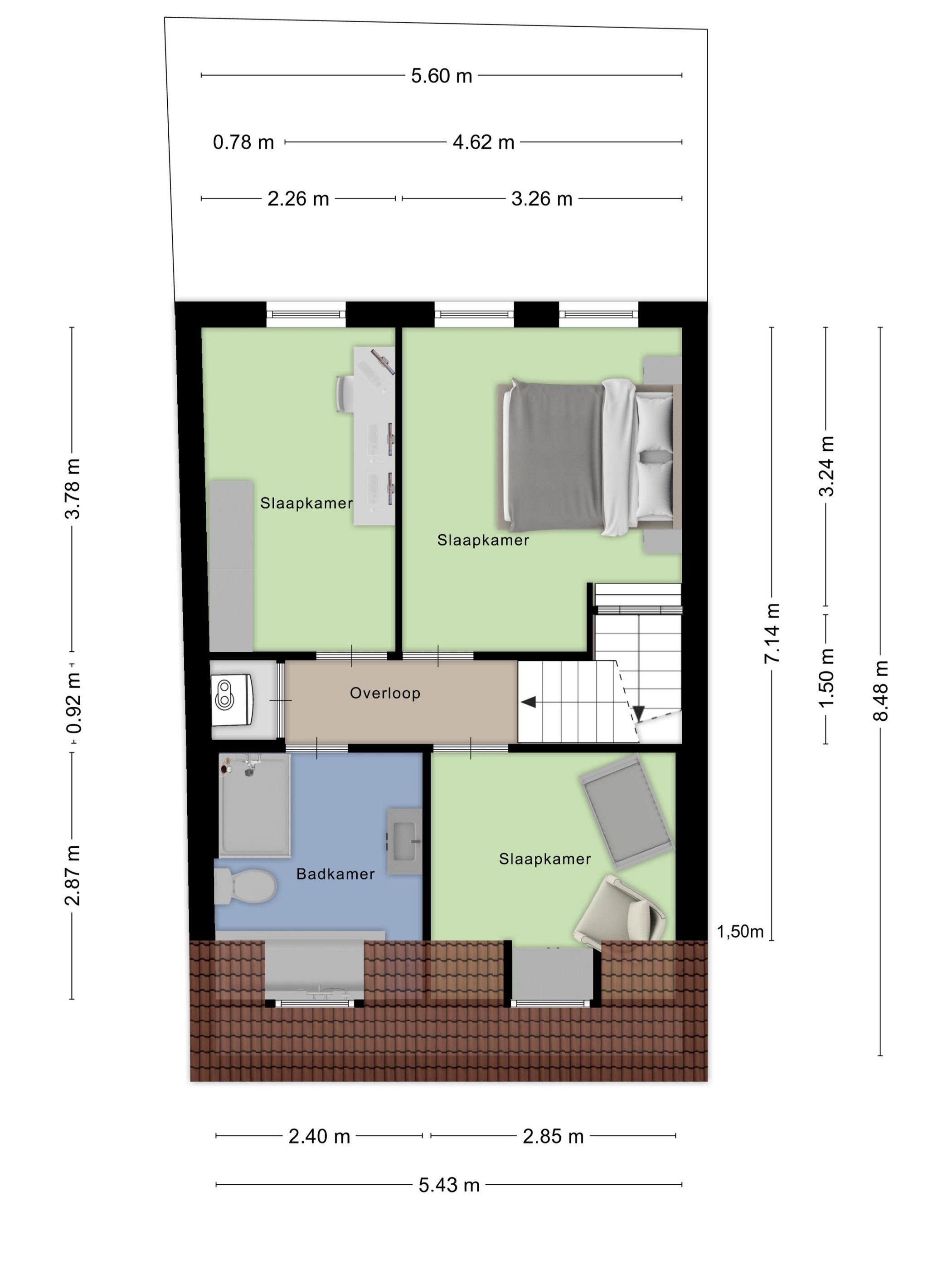 De woning beschikt over drie slaapkamers op de eerste verdieping. Vanuit de hoofdslaapkamer leidt een vaste trap naar de tweede verdieping, die zich uitstekend leent voor extra bergruimte.