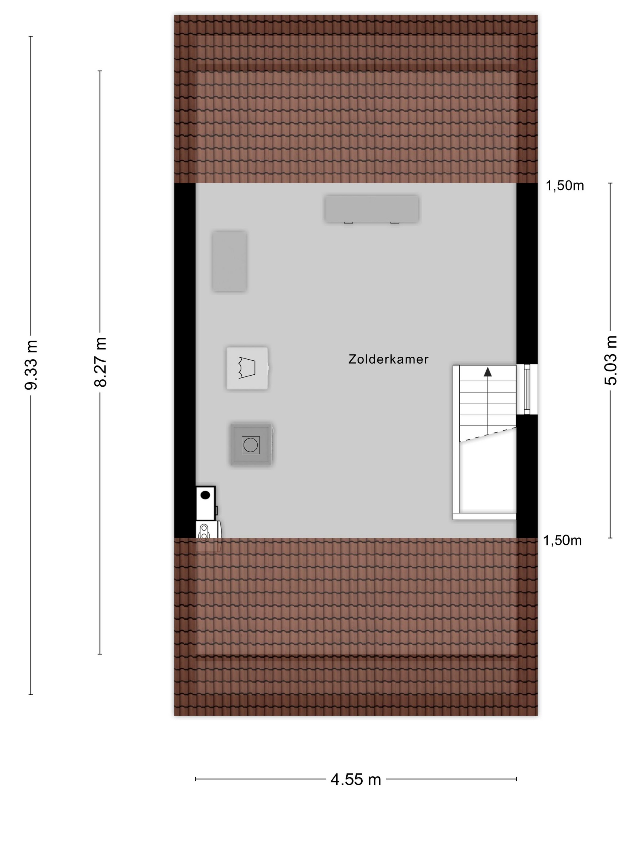 Zolderruimte met opstelplaats hybride warmtepomp, omvormer en wasmachine-/drogeraansluiting, wandafwerking structuurverf, tapijttegels, dakplaten in het zicht.