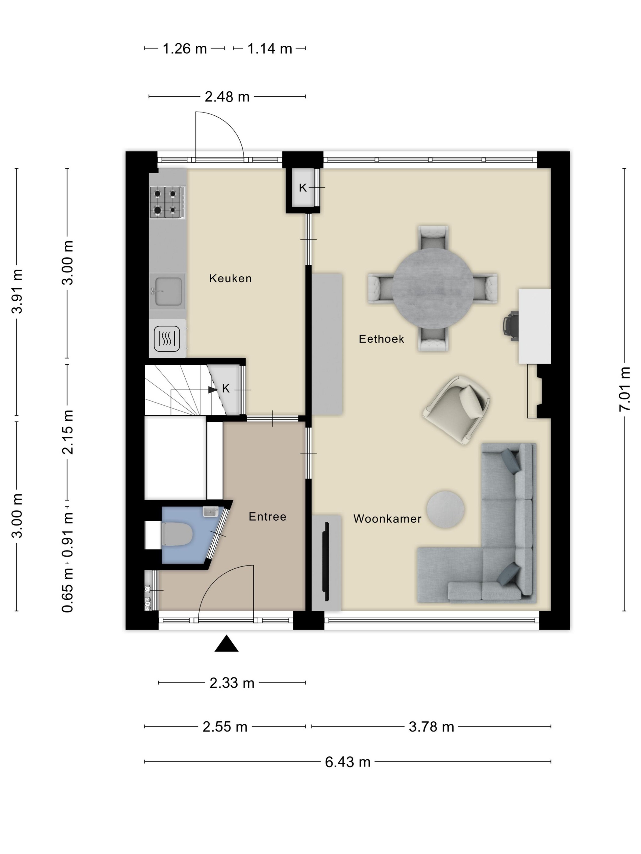 Hal/entree met een trap naar de 1e verdieping, wandafwerking stucwerk, laminaatvloer, plafond afgewerkt met stucwerk;