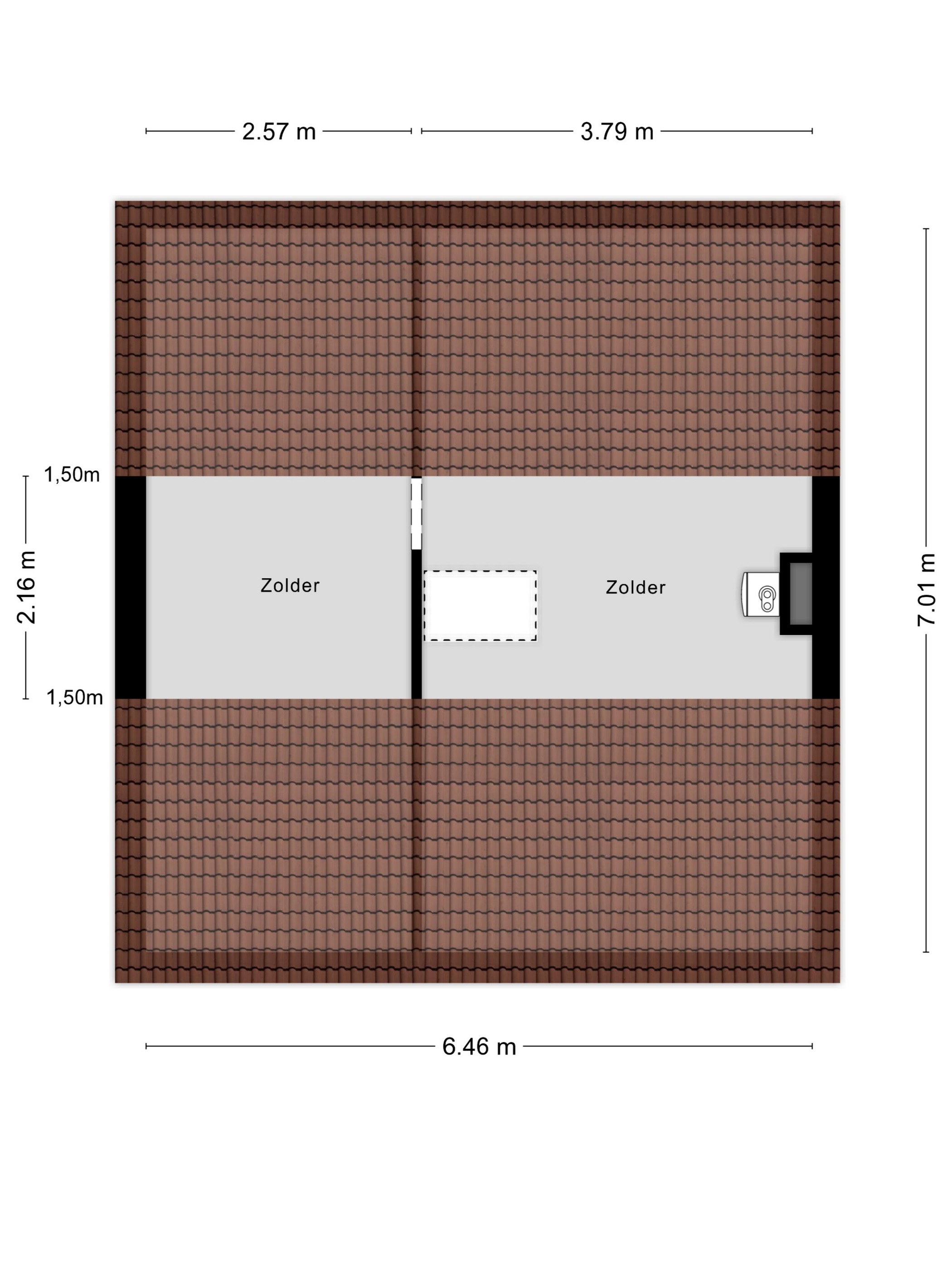 Zolderruimte met opstelplaats HR-combiketel, wandafwerking stucwerk, cementdekvloer, dakplaten afgewerkt met cementwolplaten.