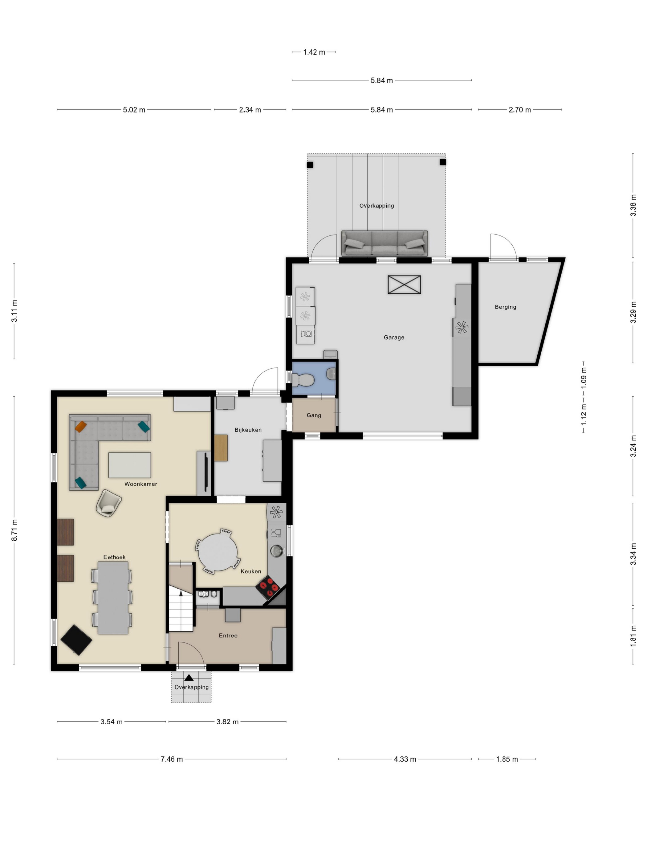 De woning beschikt over een lichte woonkamer met aansluitend een halfopen keuken, een praktische bijkeuken en een zeer royale garage met verdiepingsvloer en veel bergruimte.