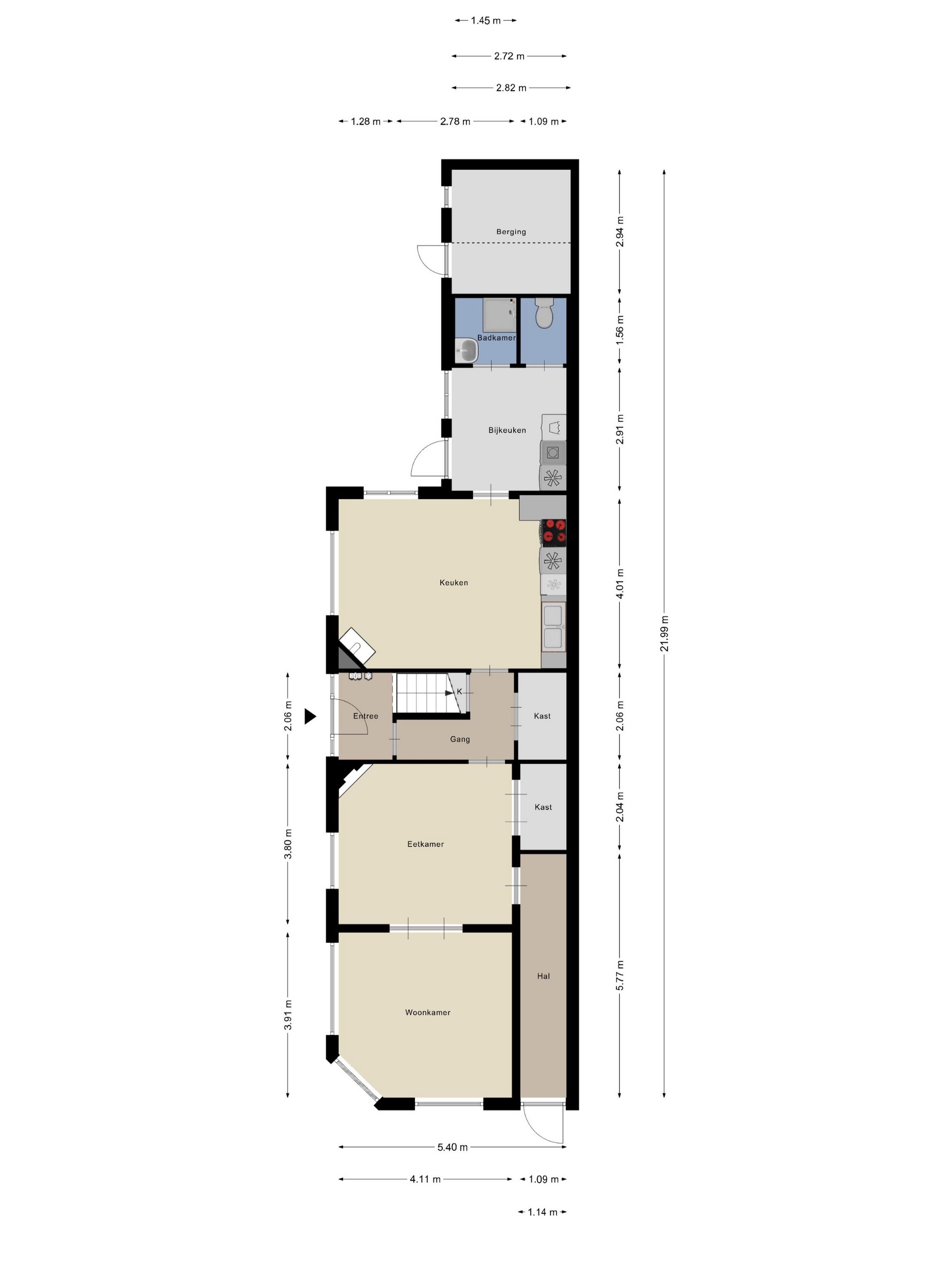 bijkeuken met wasmachine-/drogeraansluiting, wandafwerking stucwerk, zeilvloer, plafond afgewerkt met boardplaten, deur naar tuin/terras;
