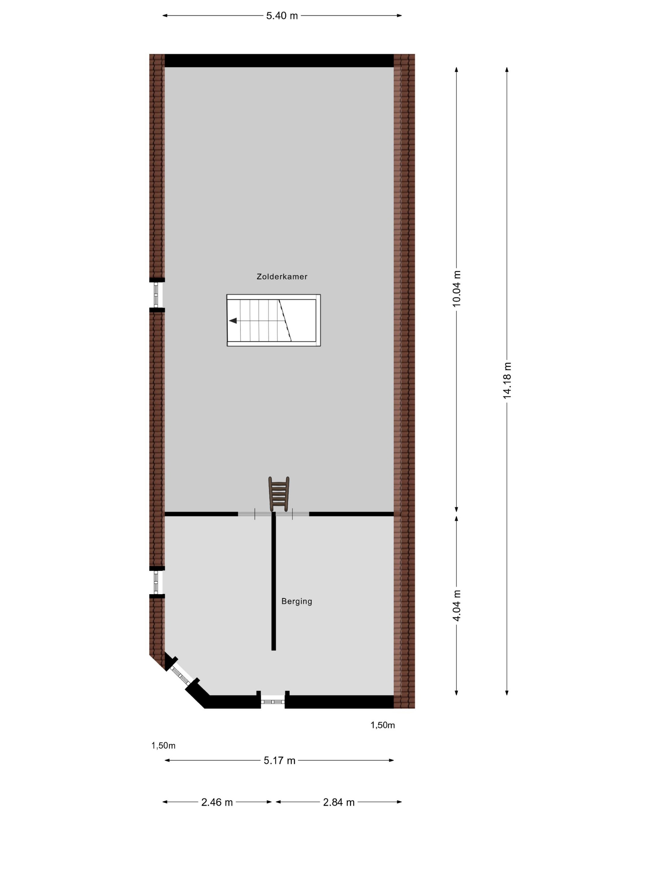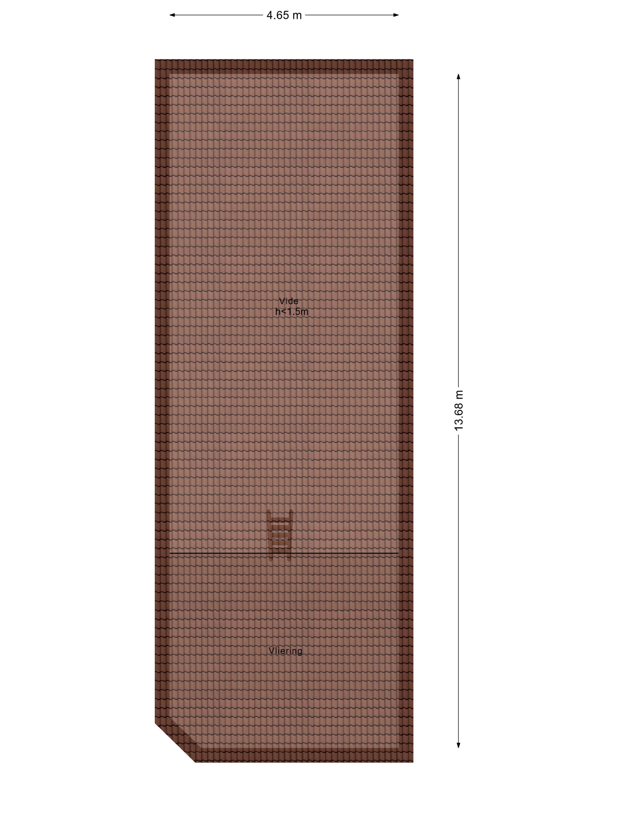 Open zolderruimte met opstelplaats HR-combiketel, houten vloer, dakbeschot in het zicht (slecht van staat).