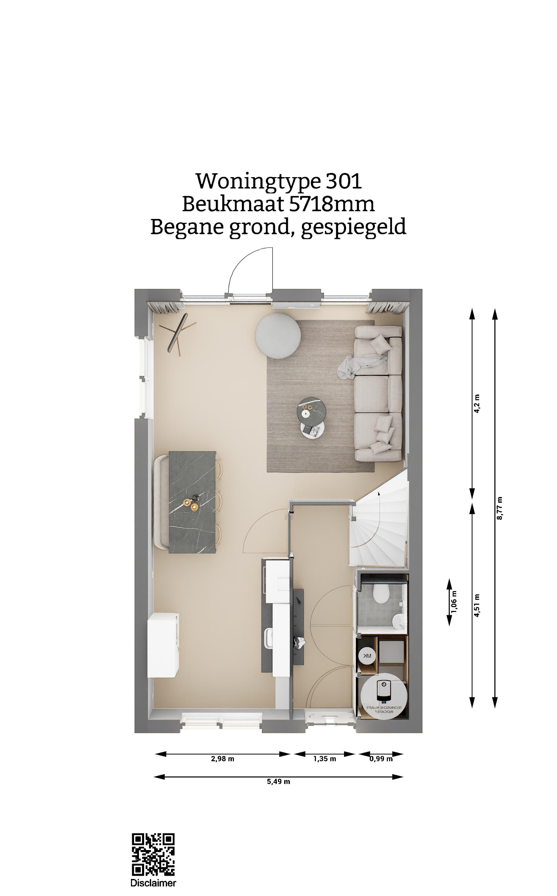 Open de voordeur en kom binnen in de brede hal. In de hal zijn de techniekruimte en de meterkast. In de hal vind je ook het toilet, en de trap naar de eerste verdieping. Aan het einde van de hal is de deur naar de fijne woonkamer. Hoe richt jij deze in? Aan de voorzijde is de open keuken.